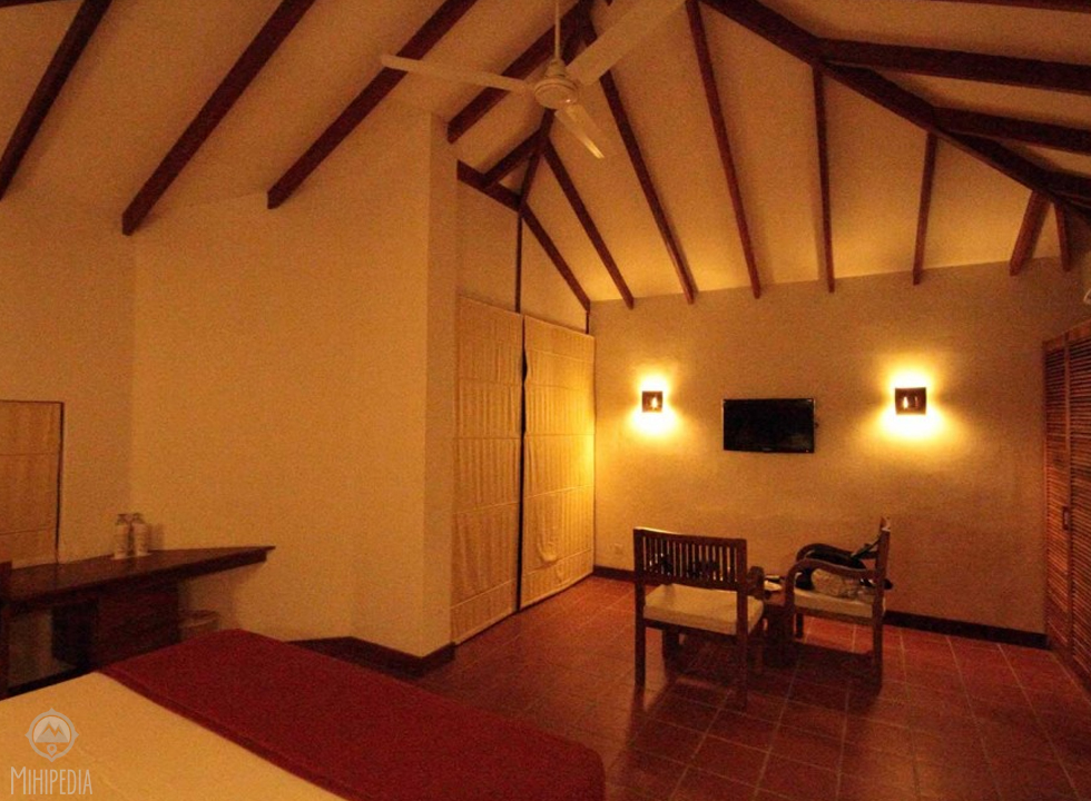 As we arrived, the ferryman was waiting to row us across the Gin Oya. In the late evening, the river was calm and still with the moon reflecting on the water. On the other side, the long passageway led us to the vast reception area where we were checked in by friendly staff. Room 111 was located further down as are all the individual rooms situated apart from each other to give guests complete privacy. All rooms, constructed with biodegradable materials, are decorated with terra cotta pots and artifacts produced by local craftsmen, including handmade local fabric adding to the ethnicity of the hotel. Adding luxury to the room is a flat screen monitor with cable TV, and en-suite bath opening out to the night sky and a king-sized bed. A private balcony looks out into the vast, manicured gardens overlooking the Indian Ocean.