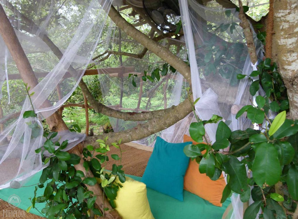 The tree houses, the Crib and the Nest, are each designed to accommodate guests comfortably. My abode, the Nest has two floors and I cautiously climb to the topmost floor. Two mattresses and floor cushions are arranged between branches of the tree. A flimsy mosquito net encircles the tree house. It helps to keep the insects at bay. I settle in.