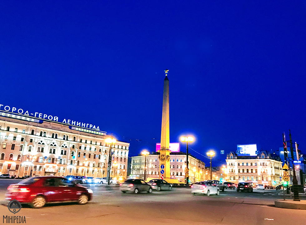 In the center of the Nevsky Prospect and Ligovsky Prospect intersection is the Vosstaniya Square (Uprising Square). Its name translates as “uprising” as it was the site of many demonstrations of the Russian Revolution in 1917. In the centre of this square is the Leningrad Hero City Obelisk, erected in memory of the 40th anniversary of the Great Victory in World War II. The obelisk is a heavy granite monolith weighing 240 tons and resembles a bayonet, crowned with a golden star.