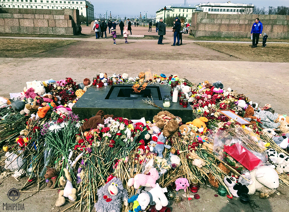 In the center of these gardens, at the Monument to the Fighters of Revolution at the Field of Mars an eternal flame was lit commemorating the victims of all wars and revolutions that had befallen this city. These are some of today’s offerings of flowers, messages, plaques and tributes laid around this flame.