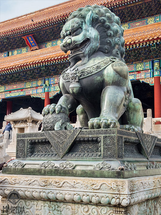 In Chinese culture, the lion is the king of the animals, and is regarded as a symbol of power and strength. Often found at entrances, they are popular as symbolic guardians, and can be seen beside the gates of many Forbidden City palace compounds. The lions are always in pairs, with the female lion on the left with her paw on a cub, and the male on the right with his paw on the globe.