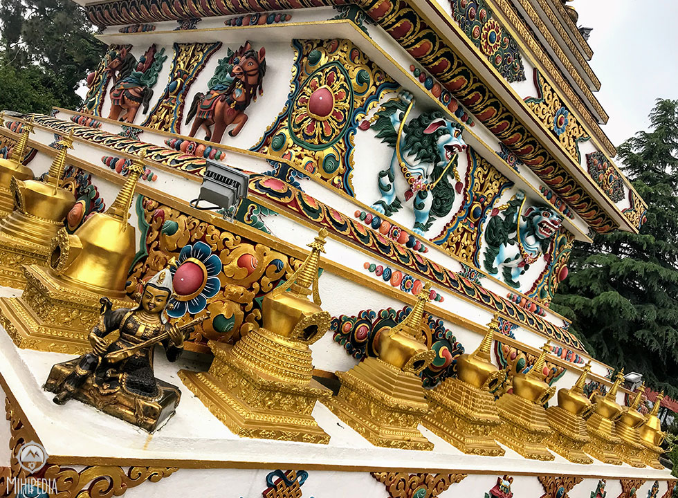 At the base of the stupa tower are the piercing pairs of eyes on each of the cardinal directions representing the all-knowing nature of the Lord Buddha. The canopy below has 13 steps symbolizing the 13 stages of Bodhisattva’s ground for the enlightenment. At ground level there is a brick wall with 147 niches and 108 images of the meditational Buddha inset behind copper prayer wheels.