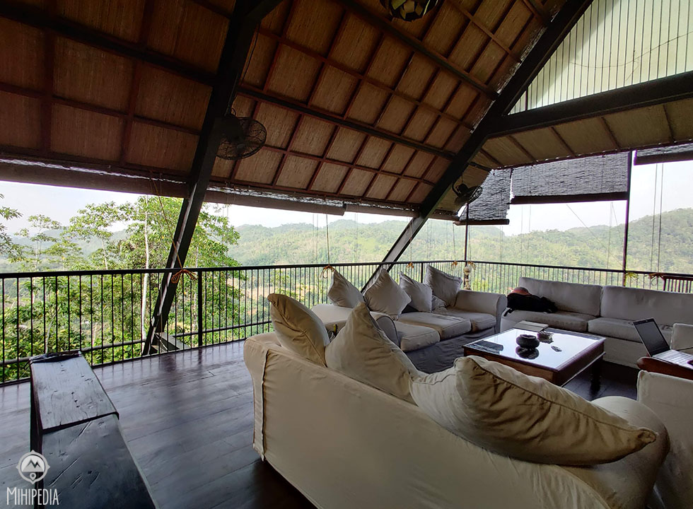 An open sitting area with comfortable sofas overlooks the vast jungle ahead.