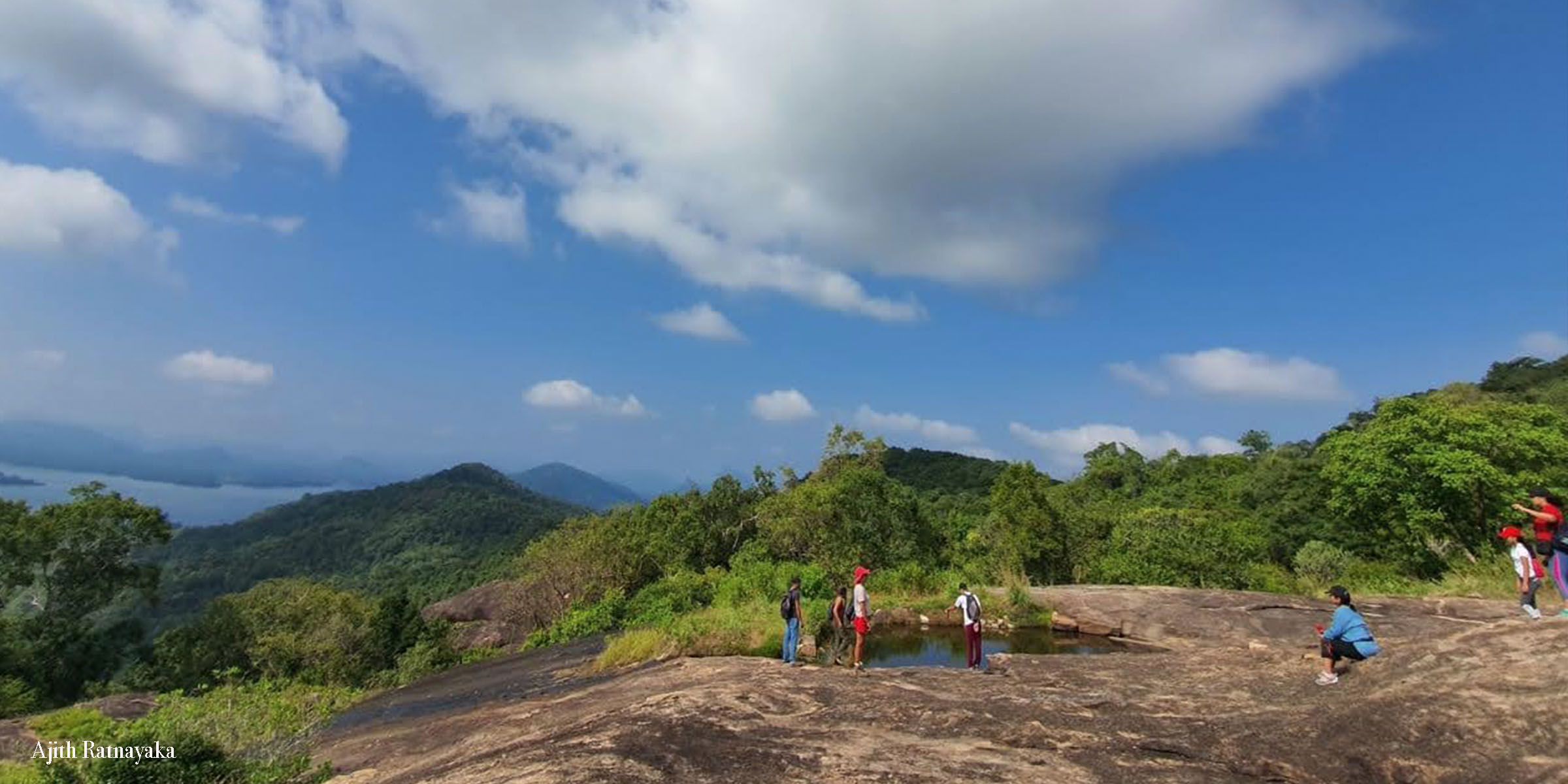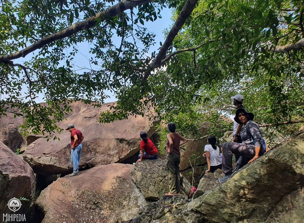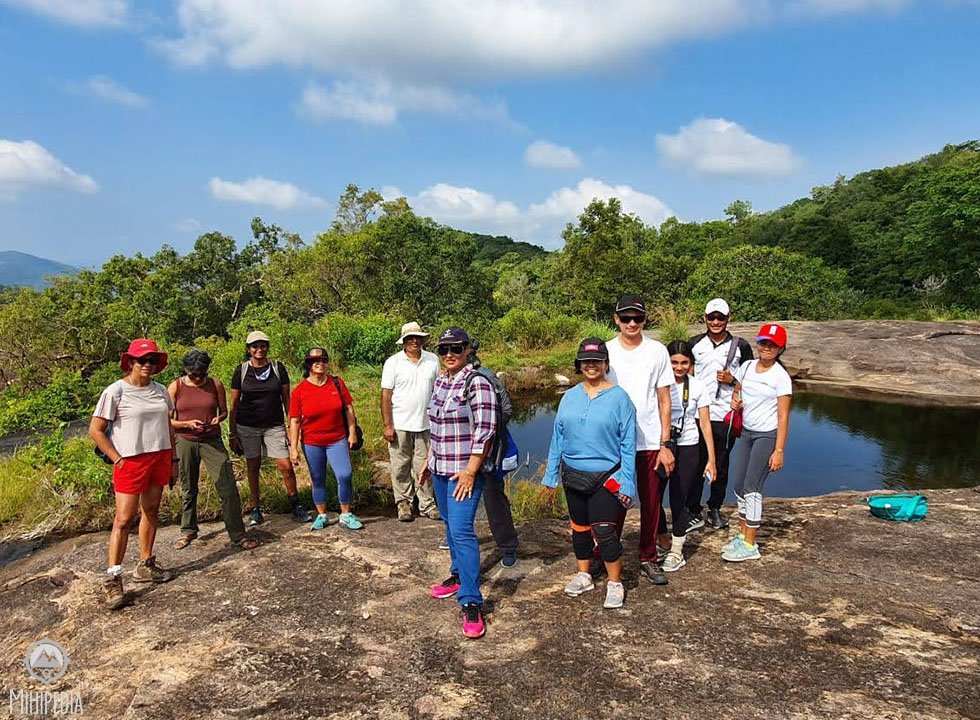 About 1hr 15min later we step onto a large rock plateau of the “akkara pansiye gala” (500 acre rock). There is a pond with plenty of fish swimming in clear water that seemingly never dries up. But it is the view of the “navagiriaruweva” (lake surrounded by nine mountains) that is breathtaking.