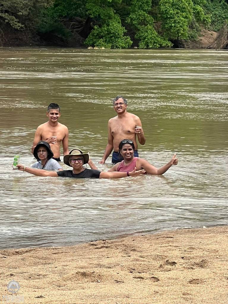 Feeling the heat of the day, we head to the banks of the majestic Mahaweli River. The water, despite being murky, is too tempting to resist, and soon we’re neck-deep in its fast-flowing currents.Ā It’s truly wonderful to relish these simple pleasures in life and brings back fond memories of the camping holidays spent with my siblings and parents, creating cherished moments together.