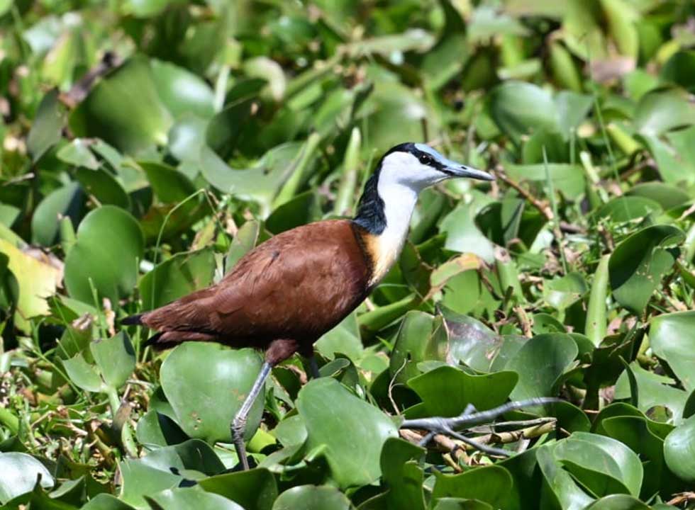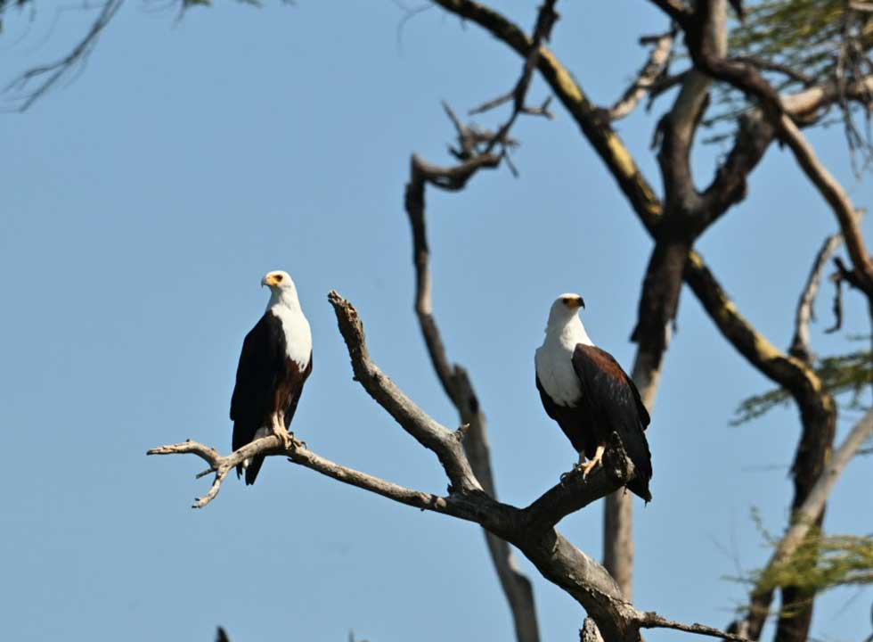 Suddenly, our guide motioned for silence and pointed skyward. Majestic African fish eagles sit high atop a tree branch, their white chests glowing in the sun, eyes scanning the water. We slowed the boat and waited. The guide pursed his lips and let out a shrill call, mimicking the fish eagle and tossed a dead fish into the water.