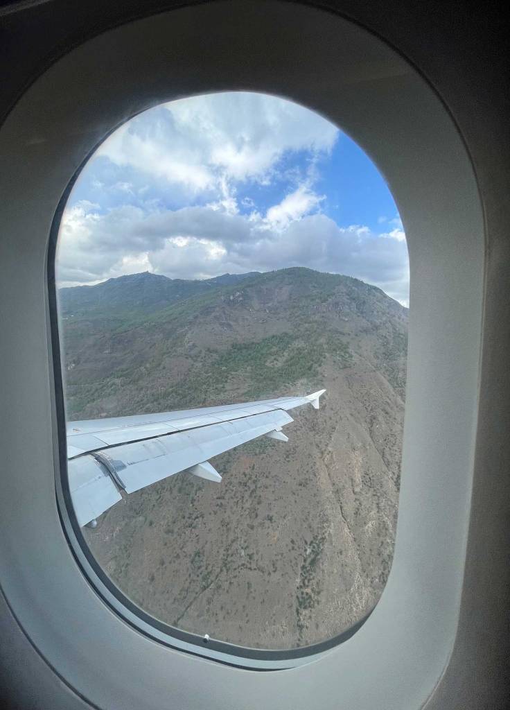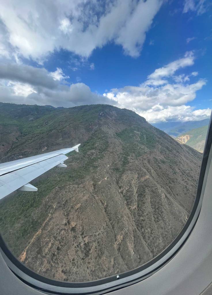 From my window seat, the approach was heart-stopping. One moment we soared above the clouds, the next we dipped sharply into a world of pine-covered mountains and prayer-flag-lined ridges. The plane banked left, then right, threading its way through impossibly narrow gaps. Hillsides rushed past just feet away, and rooftops seemed within reach. And then—a smooth, soft landing. As the wheels kissed the tarmac, a wave of relief swept through my tensed body. That landing is definitely not for the fainthearted!