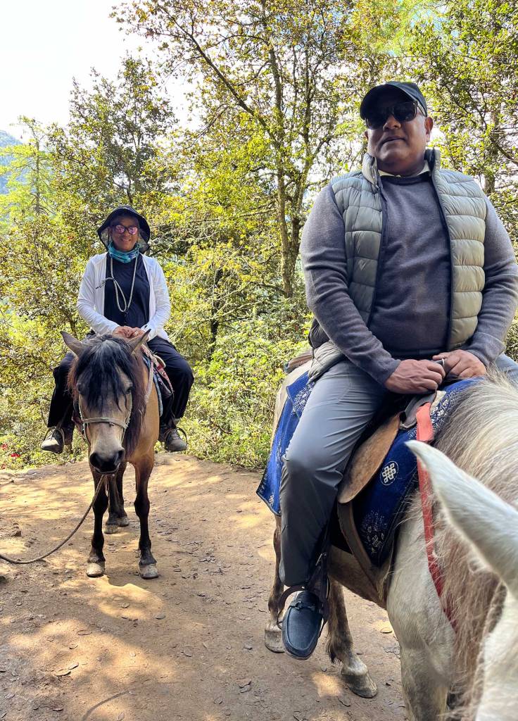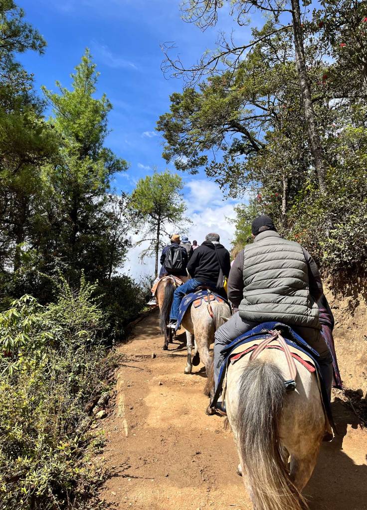 The horses seemed to know the trail better than we did giving me the chance to admire some incredible landscapes. About 71% of the total geographical area of Bhutan is under forest cover (2,730,889 ha) and the constitution of Bhutan mandates to maintain at least 60% of forest cover in perpetuity. Bhutan’s extensive forest cover and pristine environment, coupled with its strong conservation efforts, has allowed the country to have exceptionally rich biodiversity with flourishing populations of some of the rarest flora and fauna on earth.