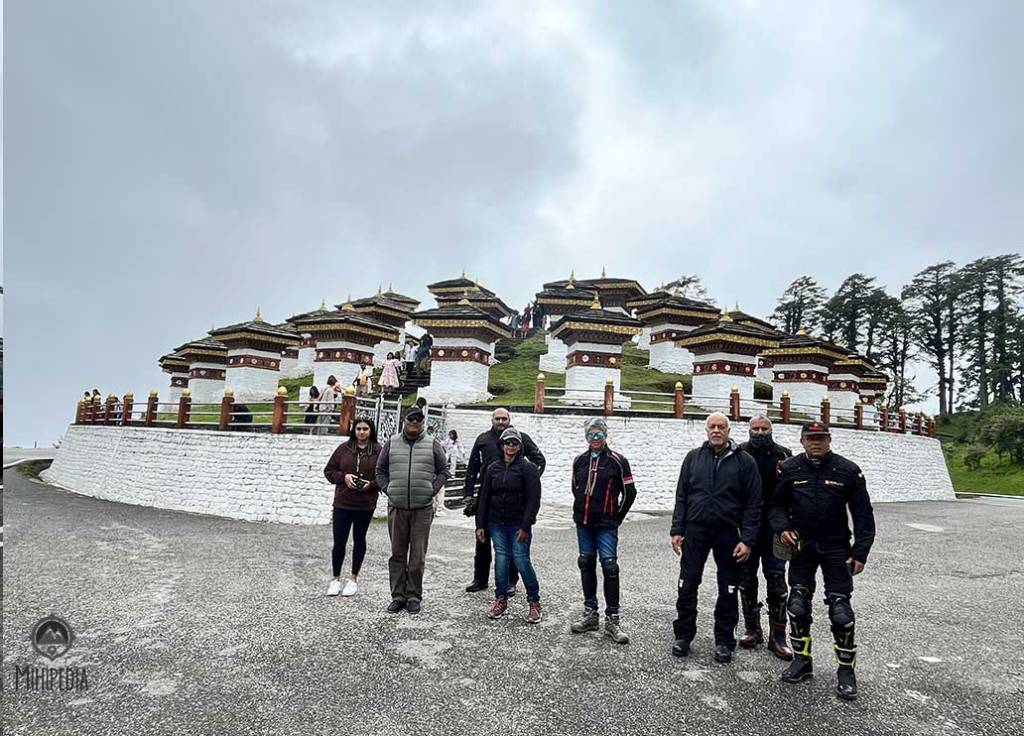Our next stop was the Dochula Pass, perched at 3,100 meters above sea level — so high it felt like we had ridden straight into the clouds. On a clear day, the snow-clad peaks of the Himalayan range stretch out across the horizon, but such days are rare. Today, the mountains stayed hidden — cloaked in mist, teasing us from behind their veil.