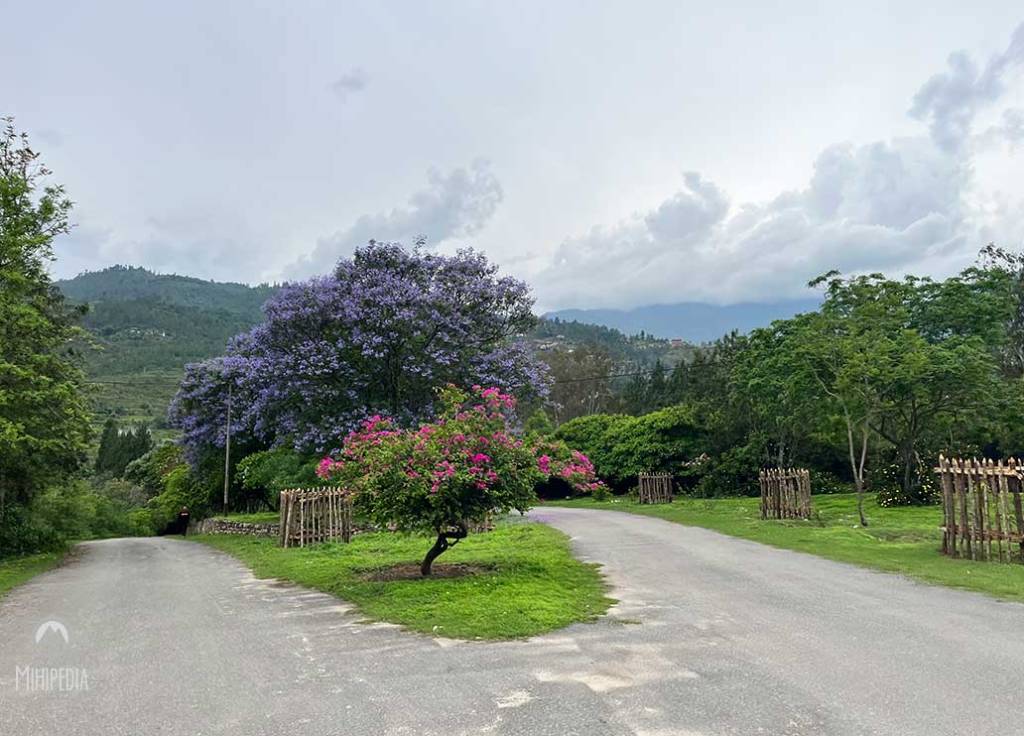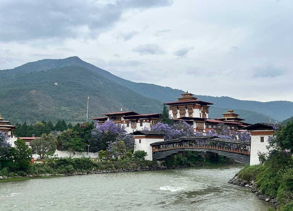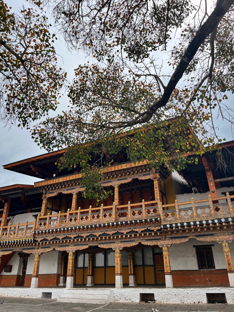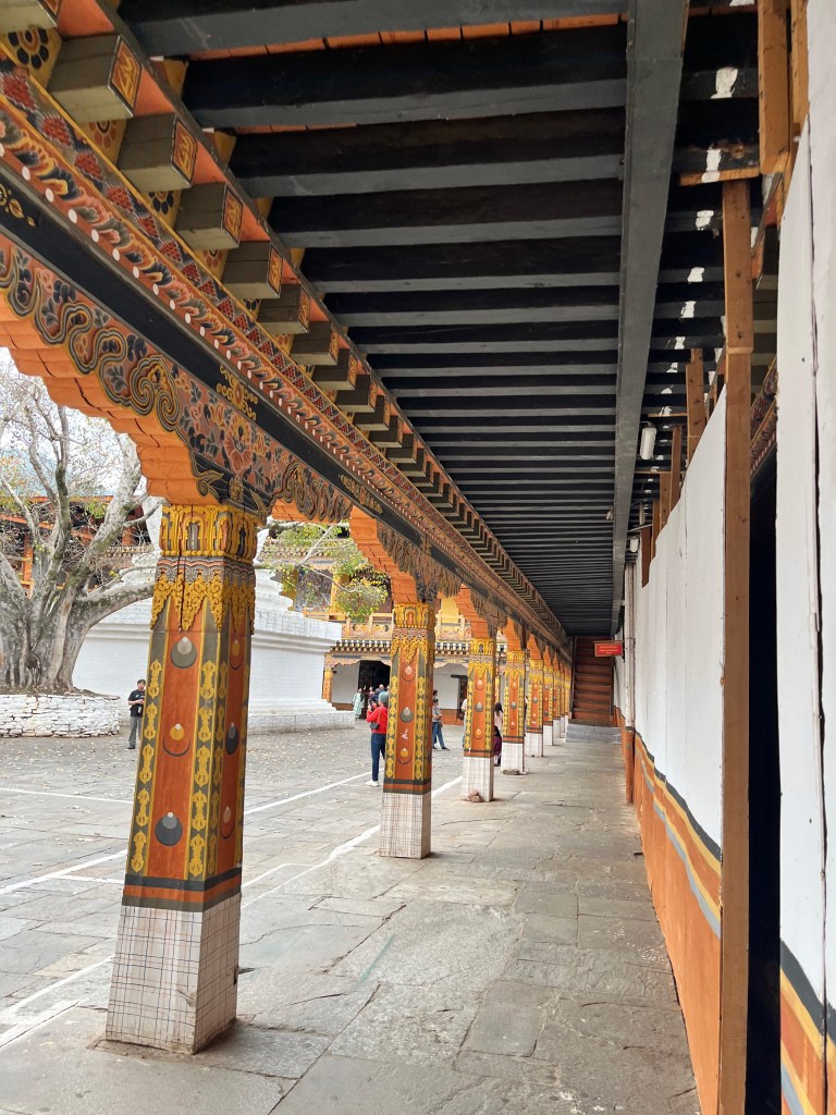 Riding up to the dzong felt like arriving at a palace pulled from legend. Nestled at the meeting point of the Mo Chhu(Mother River) and Po Chhu (Father River), the dzong rises like a dream: whitewashed walls gleaming in the sunlight, crimson roofs stacked like ceremonial crowns, intricately carved woodwork framing every window and doorway. And the driveway was equally colorful and lush.