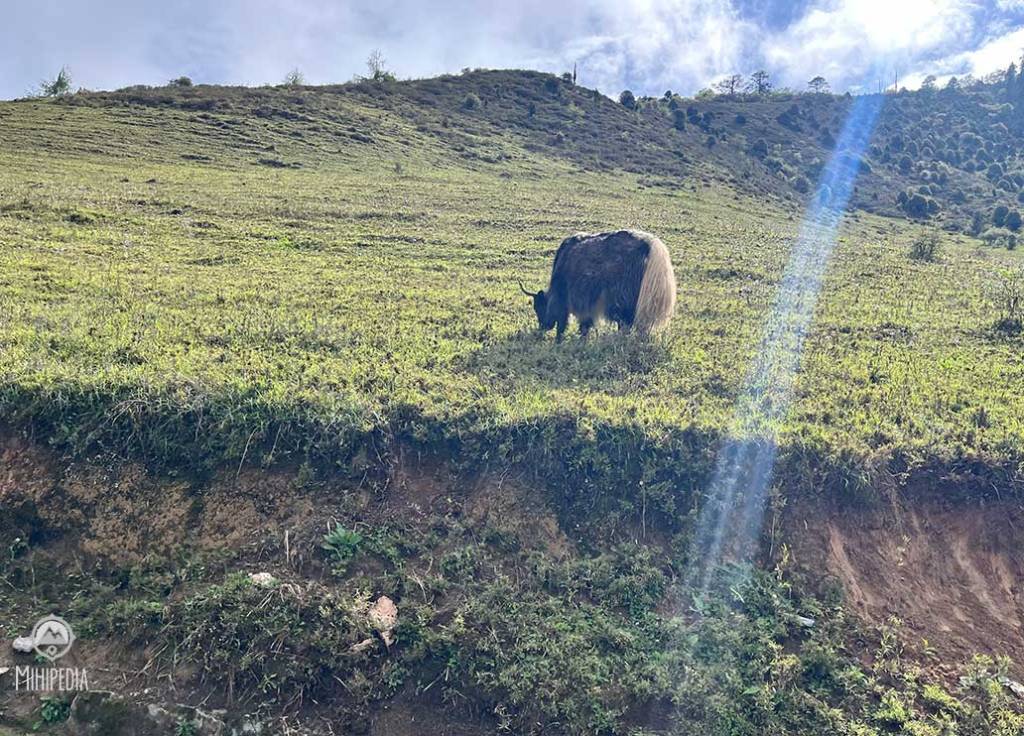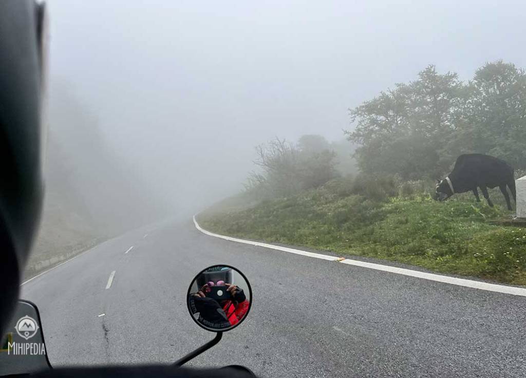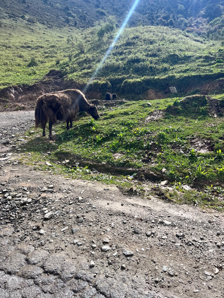 The road climbed steadily, curling through forests of spruce and fir towards Pele La Pass. Somewhere between the bends, the landscape shifted. The trees grew sparse, the air thinner—and suddenly, we saw them: yaks. Massive, shaggy, and unbothered, they grazed lazily by the roadside, their long hair flowing in the breeze, rekindling memories of our ride through Ladakh. Our first sighting.