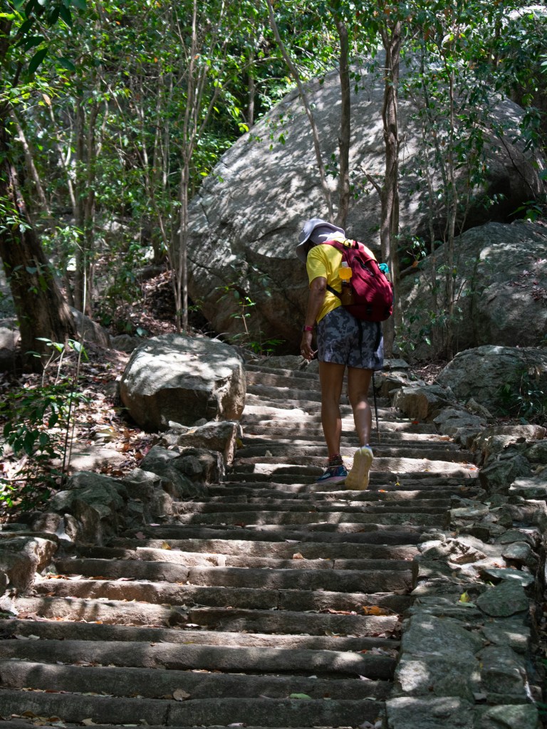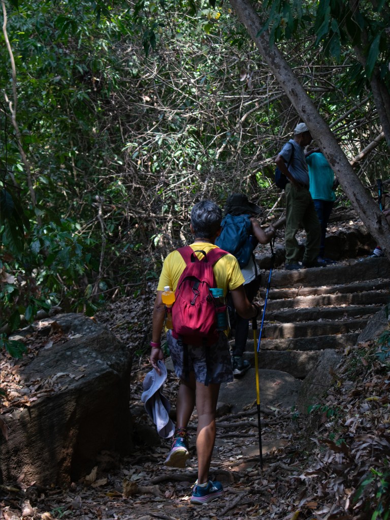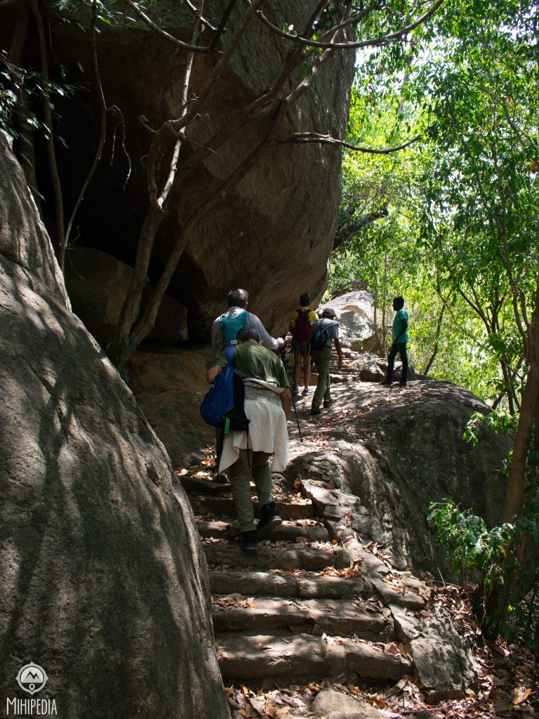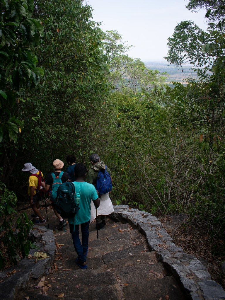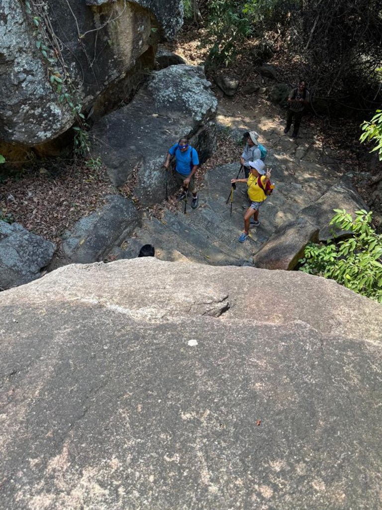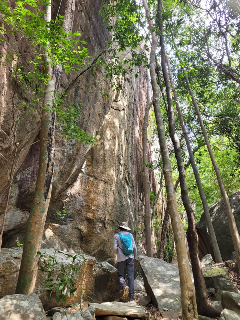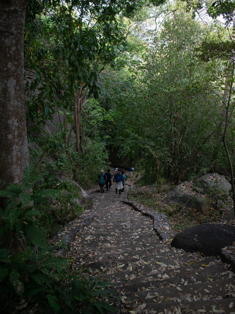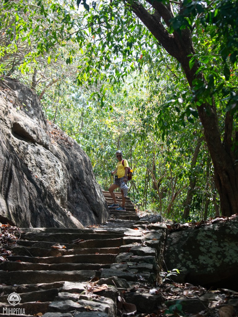 The next morning, a little late and a lot lazy, we began our climb up Rajagala Rock at 10 a.m. The sun was already punishing, pressing down with a heat that clung to us like a second skin. This time, we decided to start the climb from the western side (I had already climbed this in 2022) and as the path wound steeply upward, within minutes sweat was streaming down our backs. What made it bearable was Indika, our guide, whose easy smile and endless stories wove history and folklore into every step.