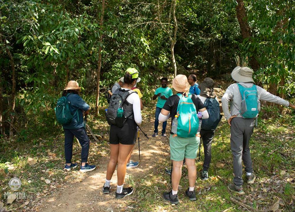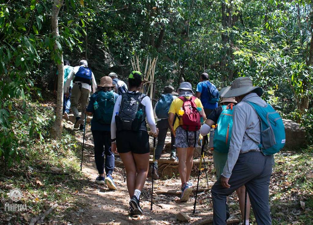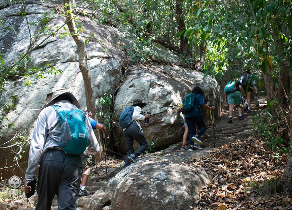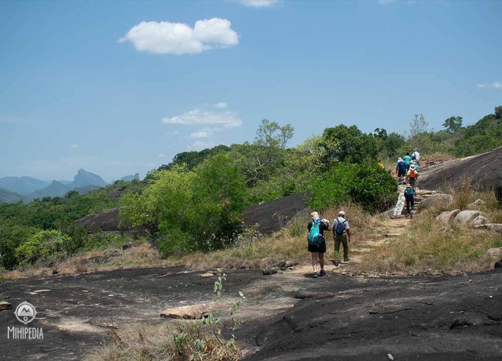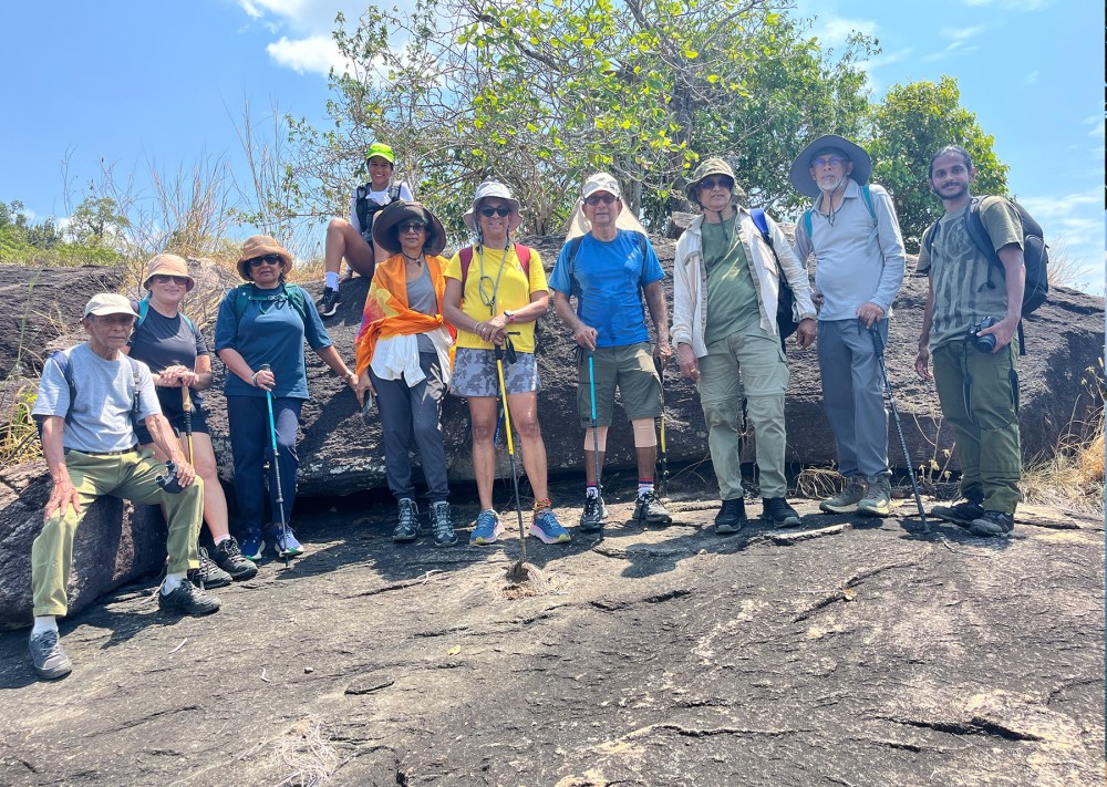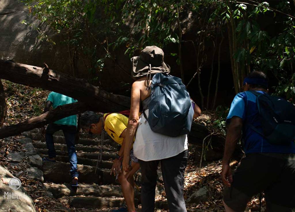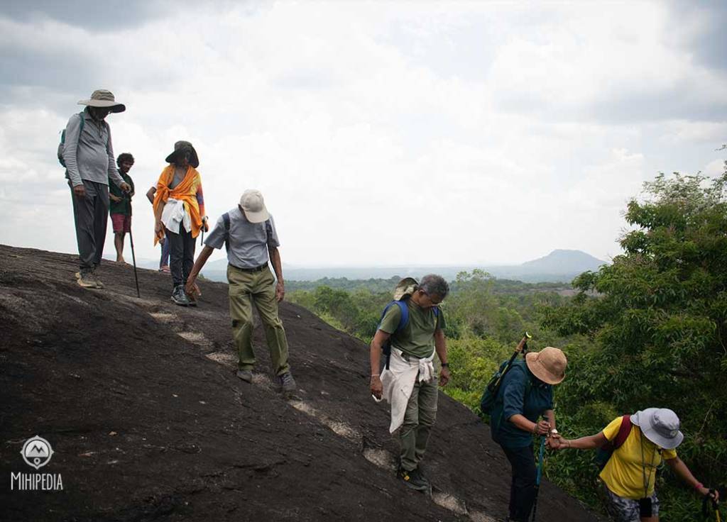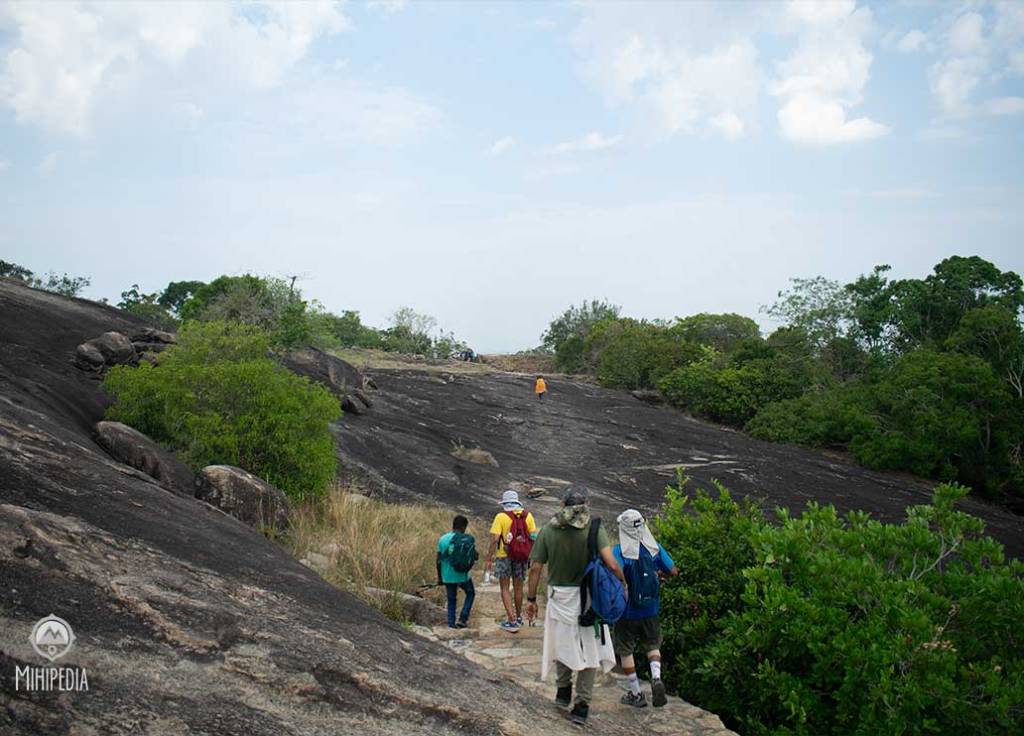 The next morning, a little late and a lot lazy, we began our climb up Rajagala Rock at 10 a.m. The sun was already punishing, pressing down with a heat that clung to us like a second skin. This time, we decided to start the climb from the western side (I had already climbed this in 2022) and as the path wound steeply upward, within minutes sweat was streaming down our backs. What made it bearable was Indika, our guide, whose easy smile and endless stories wove history and folklore into every step.