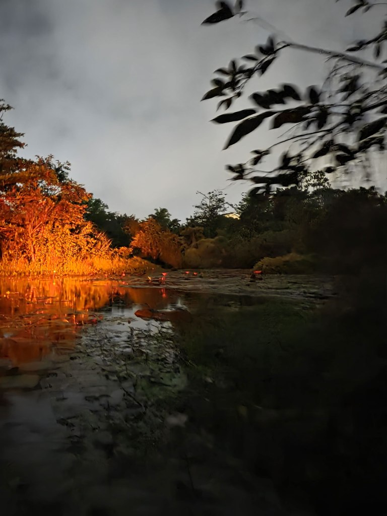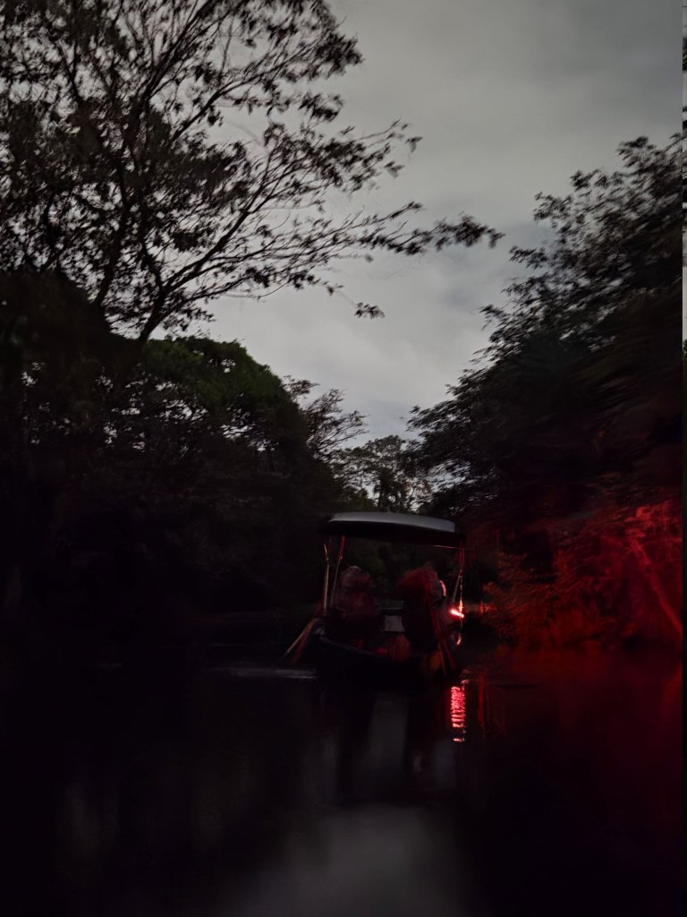 At one stop, our guides switched on UV lights. Suddenly the trees transformed. Lichen glowed faintly along the bark, shimmering like scattered stardust. The marsh revealed another layer of life invisible to the naked eye.
