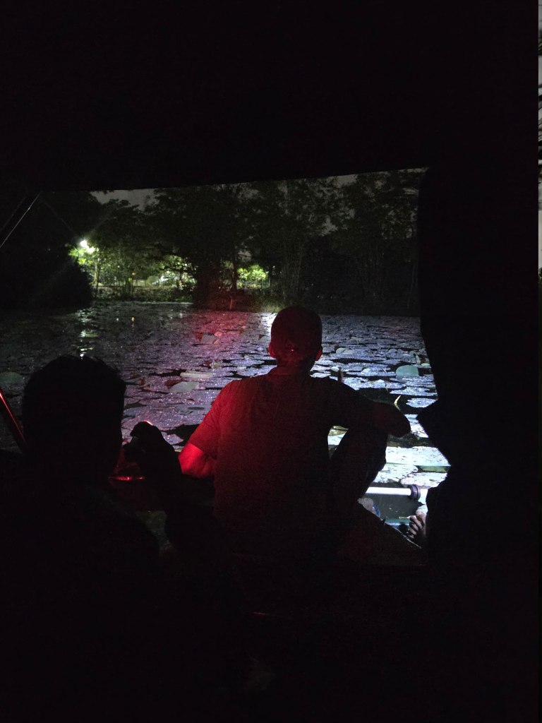 As part of Fishing Cat February, we joined two late-night safaris exploring these wetlands — trading a comfortable Saturday night for muddy boardwalks, torchlight, and the thrill of the unknown. The walks began at 9 p.m. and stretched well past midnight, ending around 1 a.m. The first week there were twelve of us, the following Saturday thirteen — a small, curious group moving slowly through the dark with our guides, John Wilson, Moditha Kodikara, Nilanjan Wijethileka, Maduranga Ranaweera, Avijja Fonseka, Hasitha and Dhanushke.