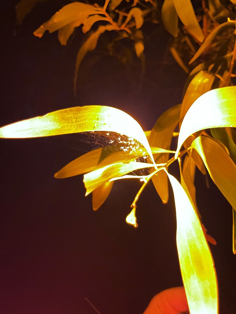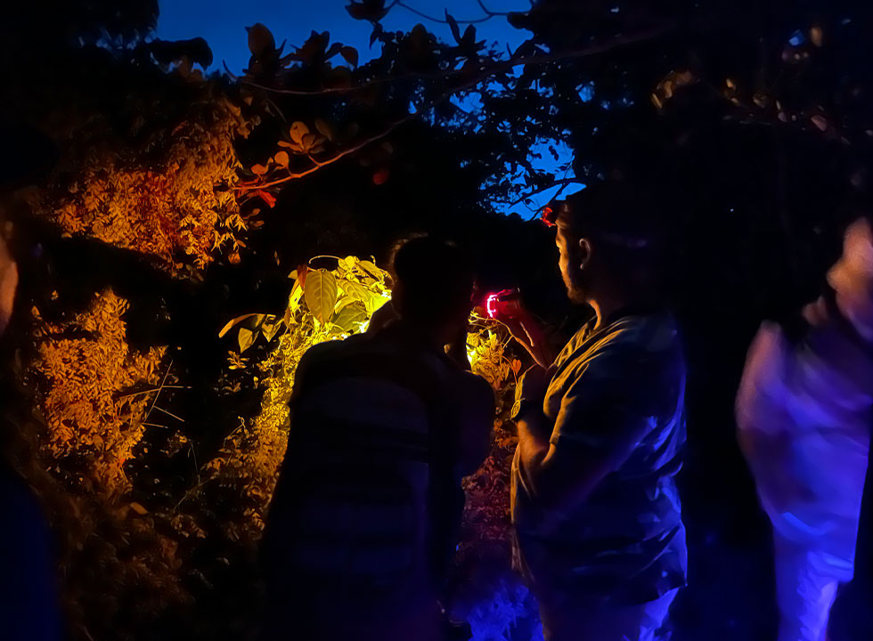 The safaris also included a slow boat ride along the oya. Gliding silently through the water was perhaps the most magical part of the night. Spider webs stretched between reeds like delicate nets, illuminated briefly by torchlight before fading back into darkness. Occasionally, the reflective eyeshine of elusive Saltwater crocodiles hidden along the banks flashed back at us.